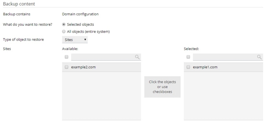 Select which objects to restore. All available objects of the selected type are displayed in the “Available” column on the left. Click the objects you want to restore. Those objects will move to the “Selected” column.