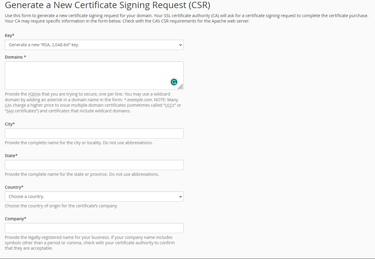cPanel: Generate CSR
