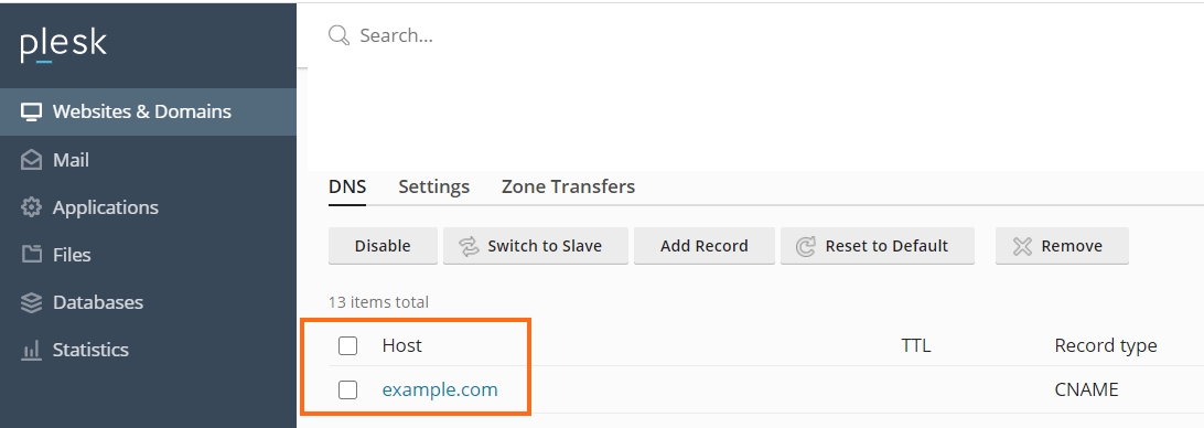 HostGator Plesk 18 DNS Settings Click on the existing CNAME Record under Host to edit.