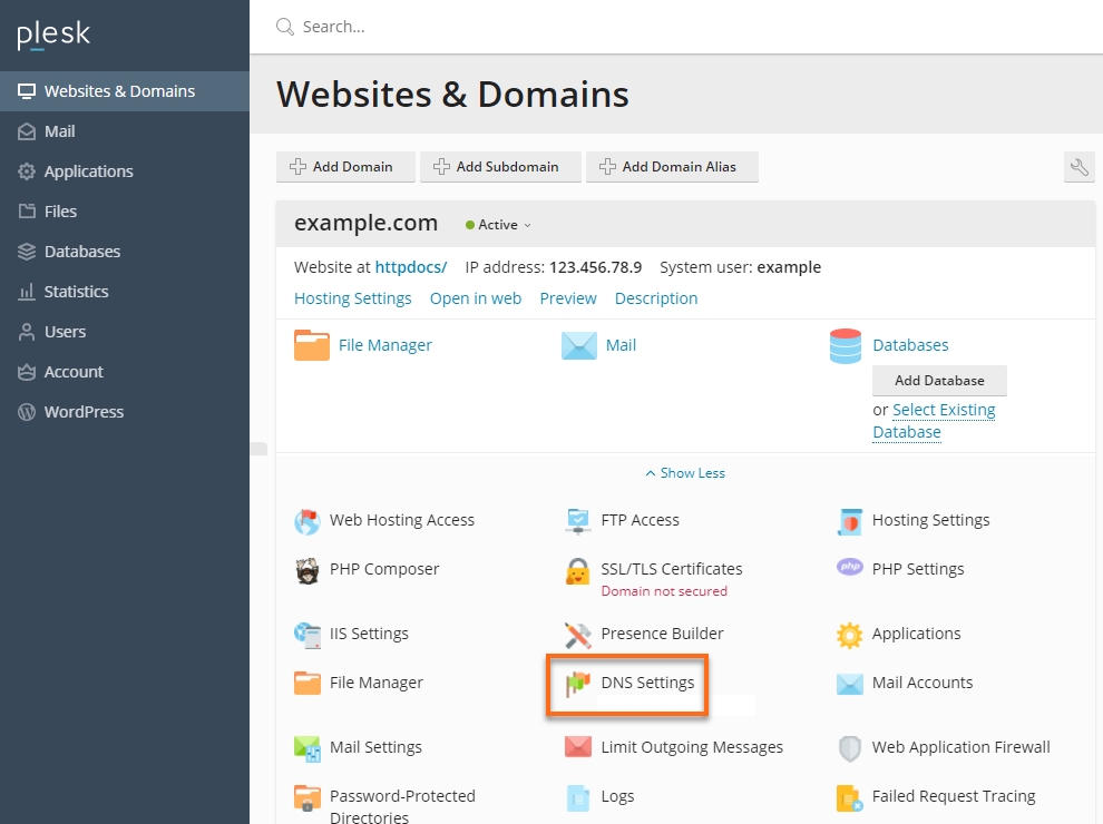To navigate to the DNS Editor in Plesk, please follow the instructions below.