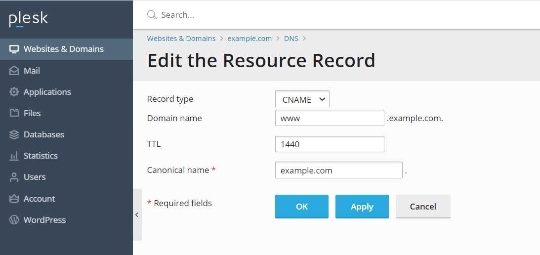 Edit Cname Record in Plesk Change the Record type to CNAME.