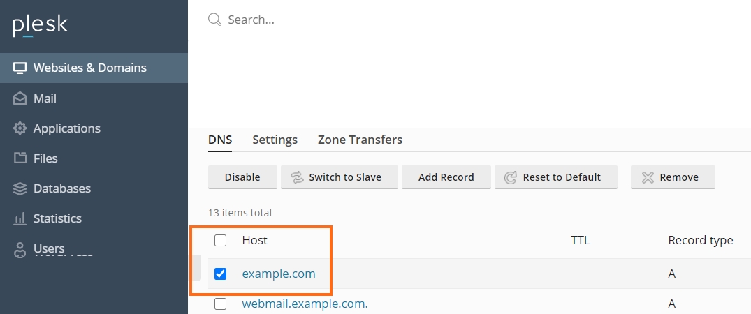 HostGator Plesk 18 DNS Settings Click on the existing A Record under Host to edit.