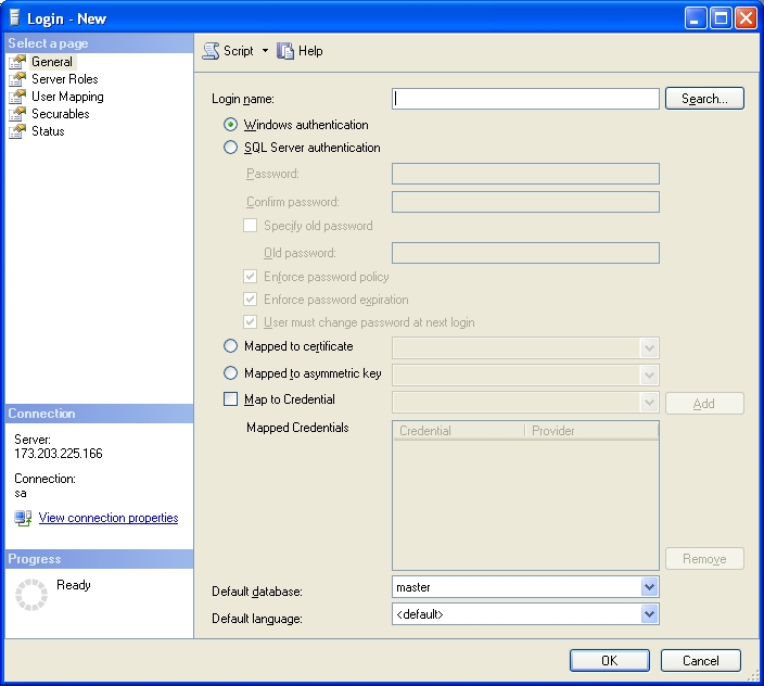 If you are using SQL authentication, you must enter an initial password and choose the enforcement options for password policy and expiration as well as whether or not the user needs to change their password when they log in.