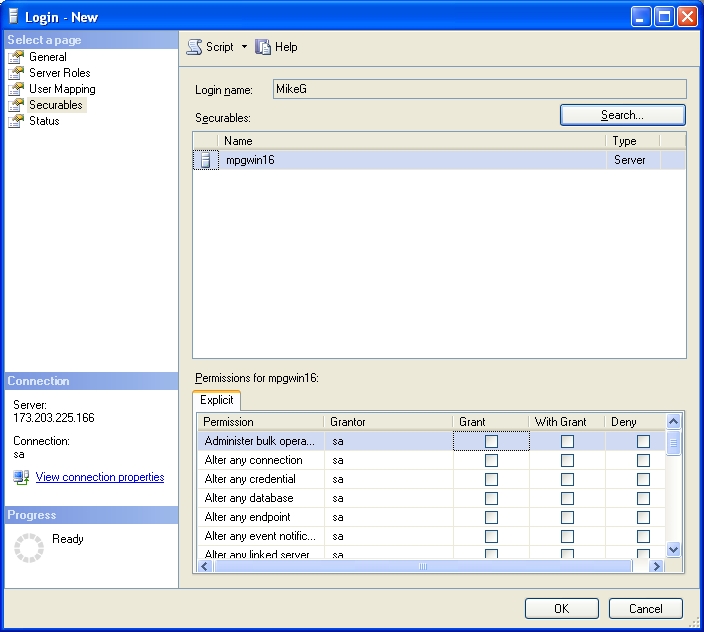 On the Securables page, select Grant, With Grant, or Deny as necessary for any of the objects in the explicit box.