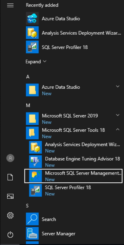 Click Start and search Microsoft SQL Server Management Studio or SSMS.