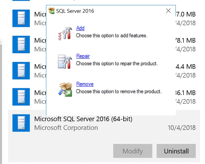 Refresh the Apps and Features window in Windows 10, Windows Server 2016, Windows Server 2019, or Programs and Features in Windows Server 2008, Windows Server 2012 and Windows 2012 R2 to verify the SQL Server instance has been removed with success.