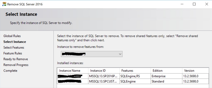 Use the drop-down to select Instance, mark the SQL Server instance name, or the option to remove only SQL Server shared features and management tools. To continue, select Next.