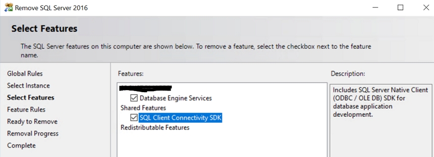 On the Select Features page, choose the features which required to be removed from the instance of SQL Server.