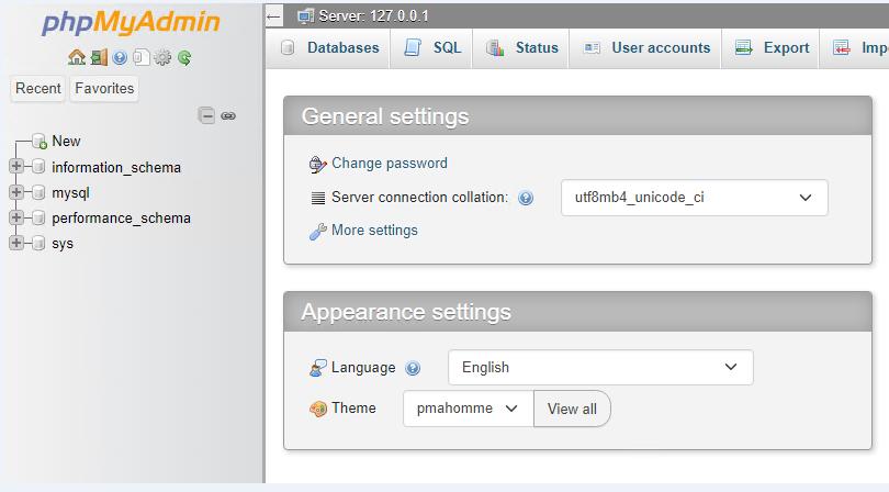 6. In your browser, go to http://127.0.0.1/phpmyadmin and log in with the root user credentials whose password was created during installation on the MySQL server.