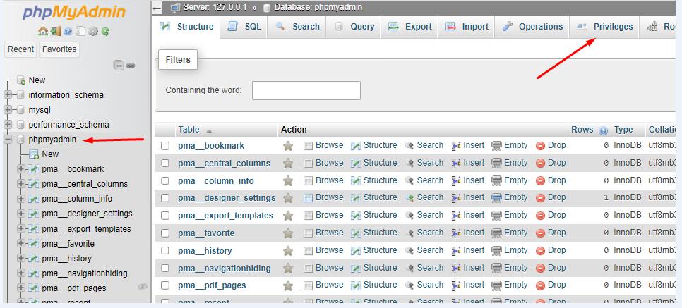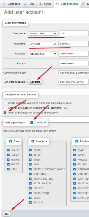 Now let's create a MySQL account and grant permissions to the database we just created. To do this, go to the phpmyadmin database and click on Privileges - Add user / Add user account