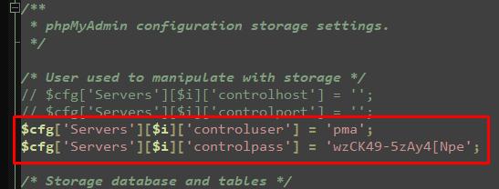 $cfg['Servers'][$i]['controluser'] = 'pma'; $cfg['Servers'][$i]['controlpass'] = 'pmapass';