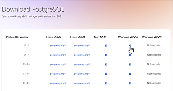 To install PostgreSQL locally on your computer, visit the installer by EDB, and download the newest version compatible with your operating system.