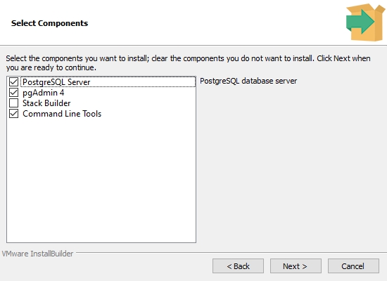 To use PostgreSQL, you will need to install the PostgreSQL Server. In this tutorial we will also use the pgAdmin 4 component, and the Command Line Tools: