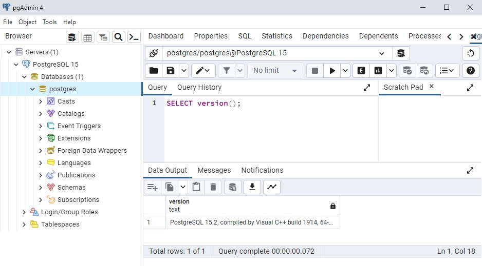Our database is empty, so we cannot query any tables yet, but we can check the version with this SQL statement: