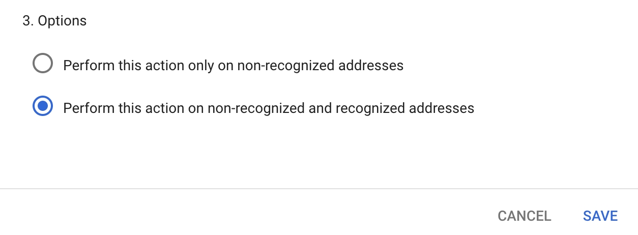 5 Finally, under 3. Options check the Perform this action on non-recognized and recognized addresses option and select Save. You're all set on the Google side!