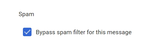 Optional: We recommend also checking Bypass spam filter for this message under the Spam header in this section. Google will not route email its filter designates as spam otherwise, which can result in valid email not reaching your Help Scout Inbox without any warning to your team. Help Scout's spam filter will still apply when the emails reach your Inbox. See Manage Spam and Unwanted Email for more.