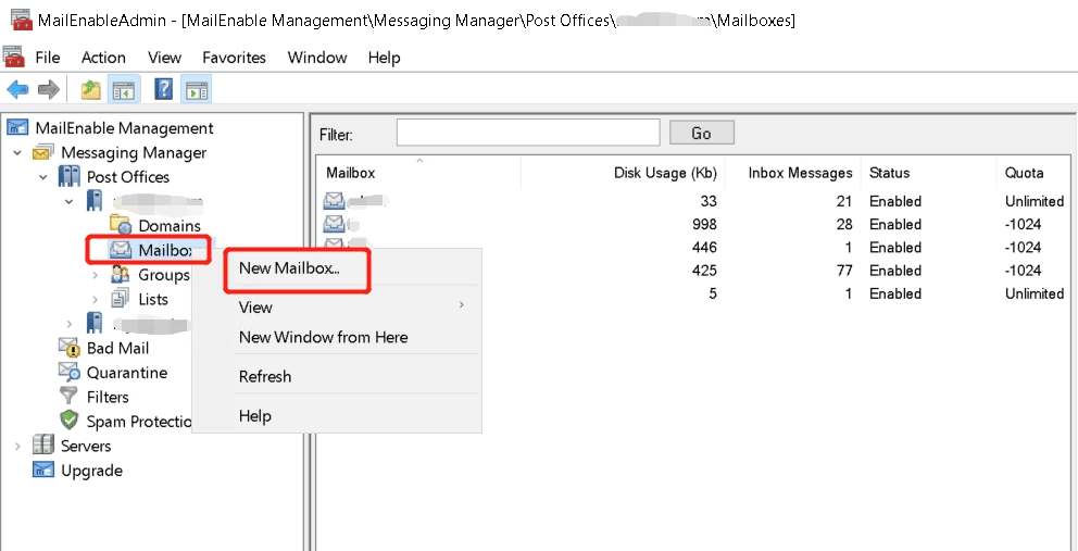 Right-click on Mailboxes under the domain.