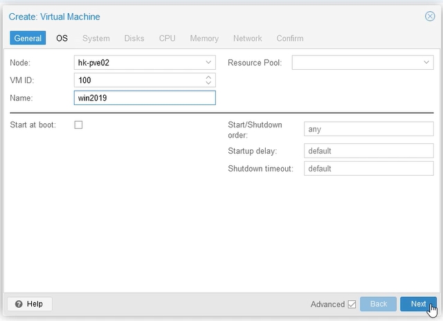 Now create a new virtual machine. Press in the main Proxmox window – Create VM.