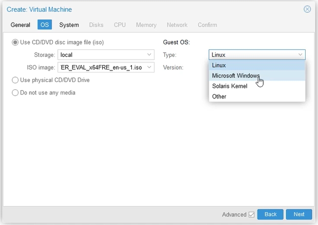 In the next tab: OS (Operational System), select the Windows image from the previously downloaded ISO disc.