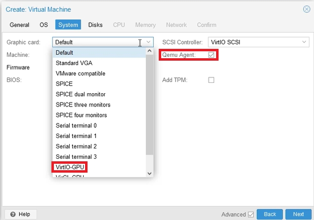 In the next tab: System, select the Qemu agent. We will use it later for advanced communication of our system with Proxmox. We also set the virtual graphics card: VirtIO-GPU. Wherever possible, we choose VirtIO (Virtual In/Out) devices, to which we will then upload drivers. Optionally, you can select: Add TPM, i.e. the encryption module. We’re not doing it now because we won’t be using it.