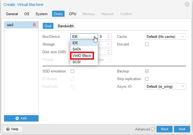 In the next tab: Disks, set the same principle: VirtIO Block, selecting the type of supported device. We’ll add the drivers later.