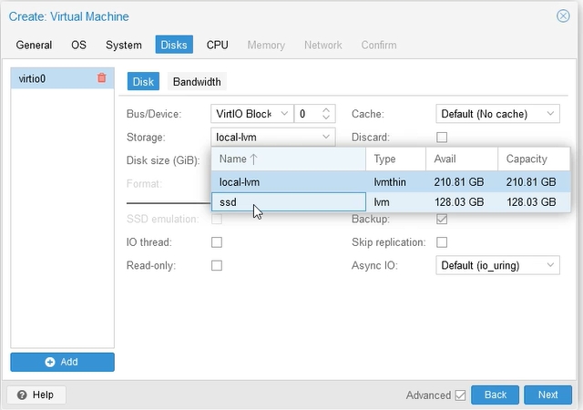 On the same tab: in the Storage field, we select a physical disk available on our Proxmox on which we will place our operating system. The ssd option is the best for us when it comes to speed.
