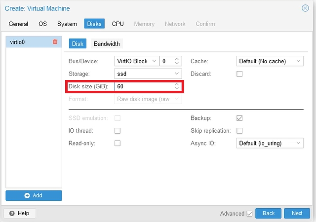 We can change the allocated disk size. How much memory we need, depends on the minimum requirements of the operating system. We also need to plan the disk space for the applications we will use on the server. 60 GB is enough for us.