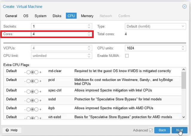 At this point, it is worth changing the processor type to: host. Thanks to this, instead of VirtualCPU, we will see our real processor, e.g. i5-6500, etc… Leaving the default selection may be practical if we move our server to another virtualization machine, where would be a different type of processor. Then we do not have to worry that the system will see a different processor than before.