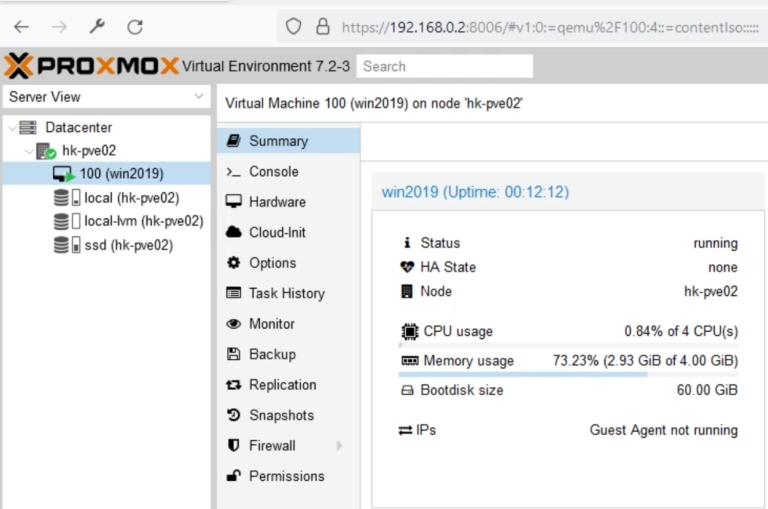Looking at the Proxmox console, we will notice that it does not see the IP of our machine yet. The displayed message: Guest Agent not running, tells us that we need to install additional controllers and drivers. This can be done manually as described below, either in the hint at the end of the article find the easier and faster method I mentioned earlier.