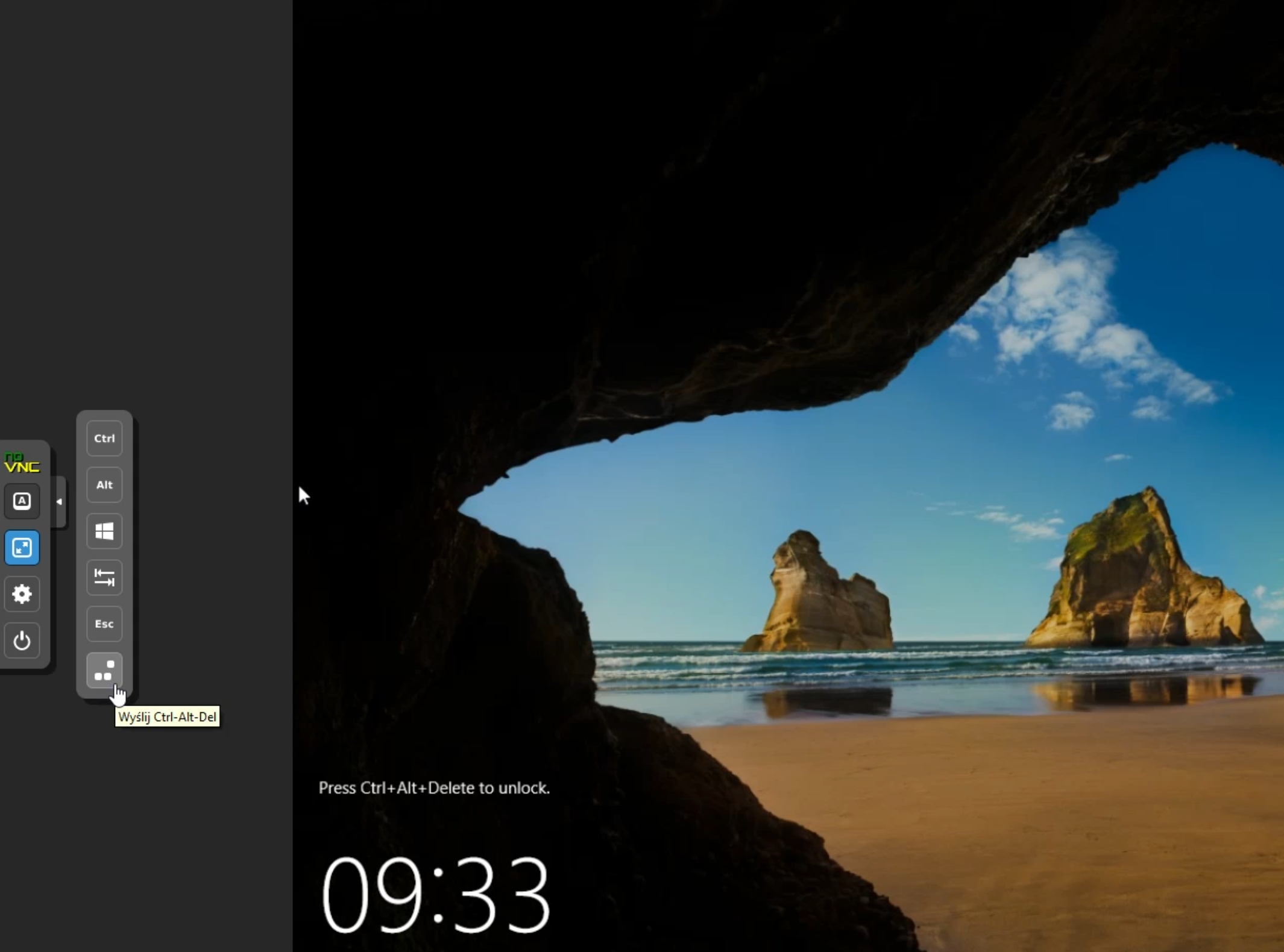 After that, the system goes to the familiar Windows login window. The VNC console allows you to select the necessary options using the panel with side drop-down buttons on the left. Click the CTRL ALT DEL icon to log into the system.