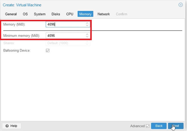 In the tab: Memory, add as much RAM as you need to use all the necessary services. Remember about the minimum system requirements. In our solution, 4GB is enough.