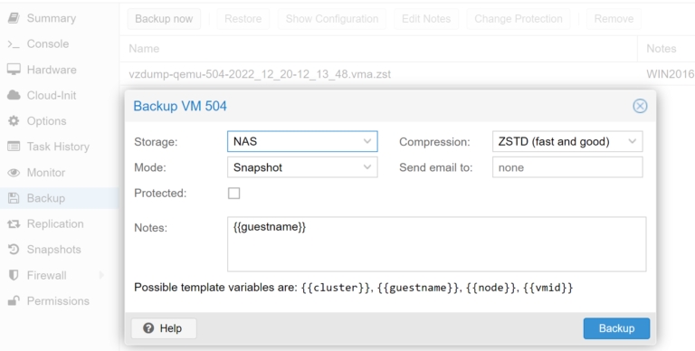 It is good practice to make a backup of our machine now. Guest Agent allows you to do this also in a running environment. In Proxmox, in the machine menu, select the item: Backup and click: Backup now. In the Storage field, select the place where we will store the backup. Leave the other options unchanged and click: Backup. Thanks to this, we will always be able to return to the machine image from the state just after installation.