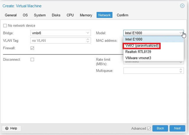 Finally, in the Network tab, the system defaulted to the only network card that Proxmox has, i.e. vmbr0. In the Model field, select the type of network card as VirtIO (paravirtualized), to be able to download dedicated drivers later.