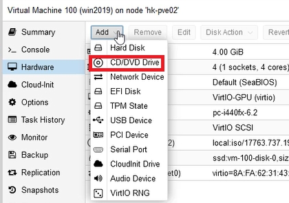 Once the virtual machine is created, it will appear in the main proxmox tree. In the new machine: in the Hardware tab, we already have the Windows installer disk in the CD/DVD drive, which we indicated when creating the virtual machine. At this point, however, we need a second CD/DVD drive with our driver CD. So we choose Add > CD/DVD Drive.