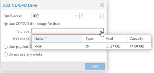 In the Storage field, select an available local resource and from it: in the ISO image field, add the disc to the drivers: virtio-win.iso