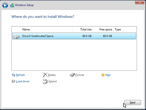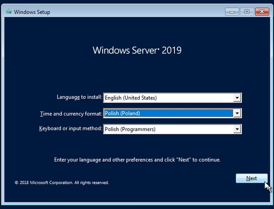 At this point, we already have all the necessary drivers. We can still look for other optional ones that will make our work easier. For example graphics card driver or “vioscsi” > “2k19” > “amd64”. Later, I will give you a more convenient and faster way to install all these drivers. Of course, we wouldn’t start the system installation without manually uploading the disk driver. Now having our drive selected by default in the window from which we installed the drivers, click: Next.