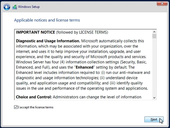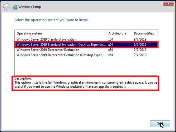 The installer will ask you to select the system you want to install. Change the default proposal from the first position and select “Windows Server 2019 Standard Evaluation (Desktop Experience)”. Desktop Experience means that the system will use graphical mode instead of text-only.
