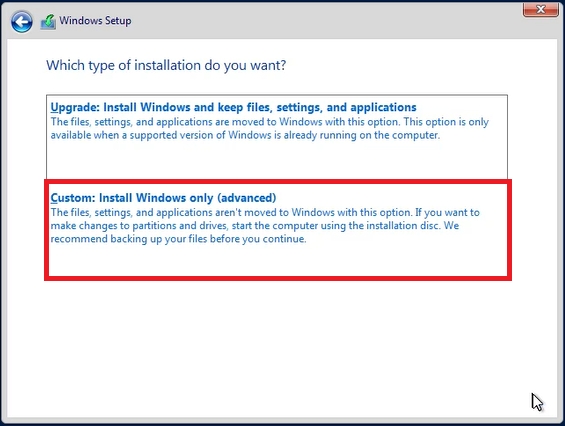 In the next step, select the installation type: “Custom: Install Windows only (advanced)”.