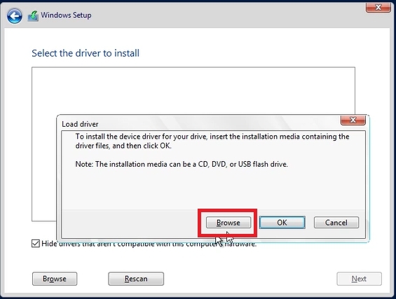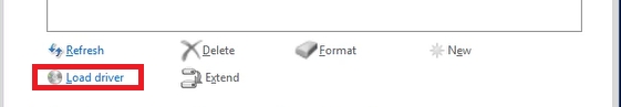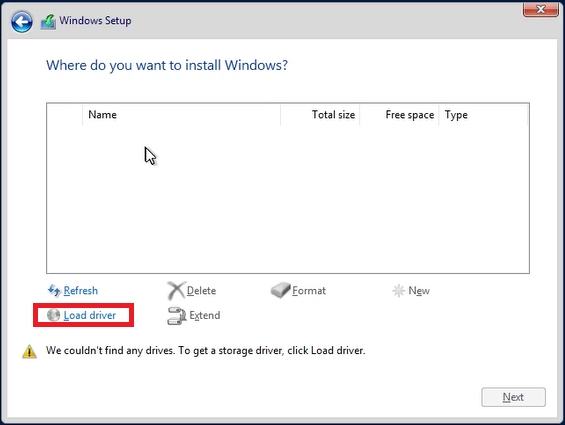 Our machine lacks the required drivers, so it can’t even see the disk space on which it could install the operating system. We now need to click: Load driver, and then: Browse to select the file system from our second drive.
