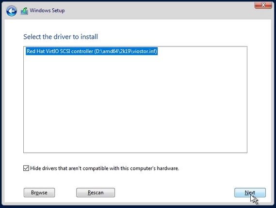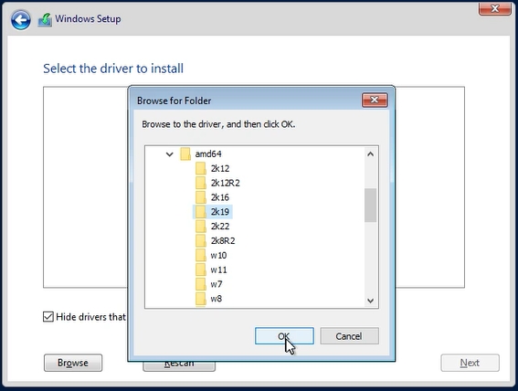 From the virtio-win.iso tile we load the necessary drivers to operate the disk. Select the directory “amd64” > “2k19”.