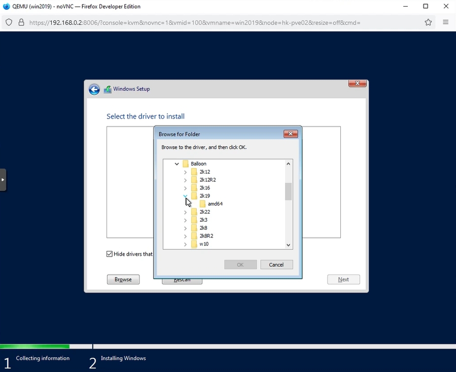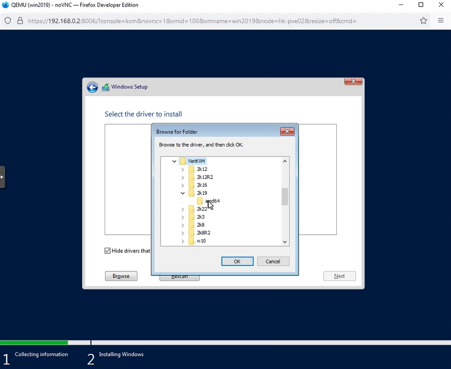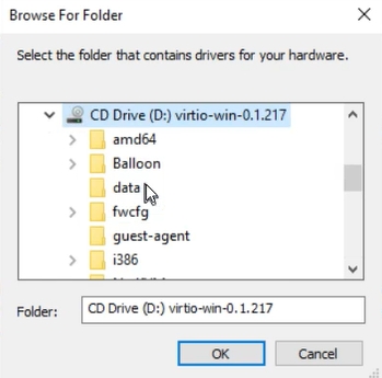 Repeat the above procedure and select: “NetKVM” > “2k19” > “amd64”. It’s a network card driver.