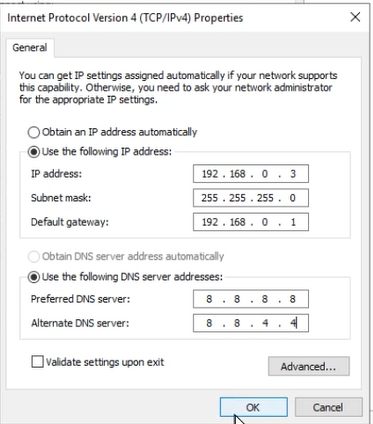 Select: Internet Protocol Version 4(TCP/IPv4) and tick “Use the following IP address”. Enter the prepared IP address, subnet mask, default gateway and DNS servers. We use reliable Google servers: 8.8.8.8 and 8.8.4.4
