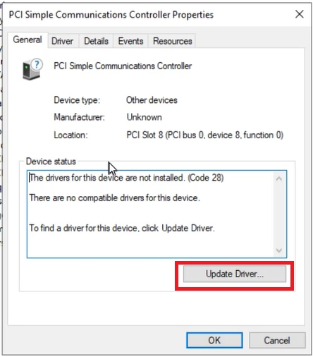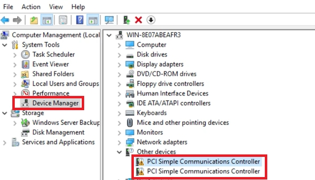 Now go to Server Manager and in the Tools tab select Computer Management. Navigate to “Device Manager” > “Other devices” > “PSI Simple Communication Controller Properties”.