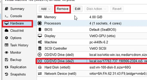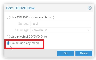 From the second drive, we can remove the CD with the drivers. Select Hardware -> CD/DVD Drive (ide0) Click Edit and select “Do not use any media”.