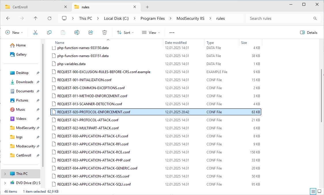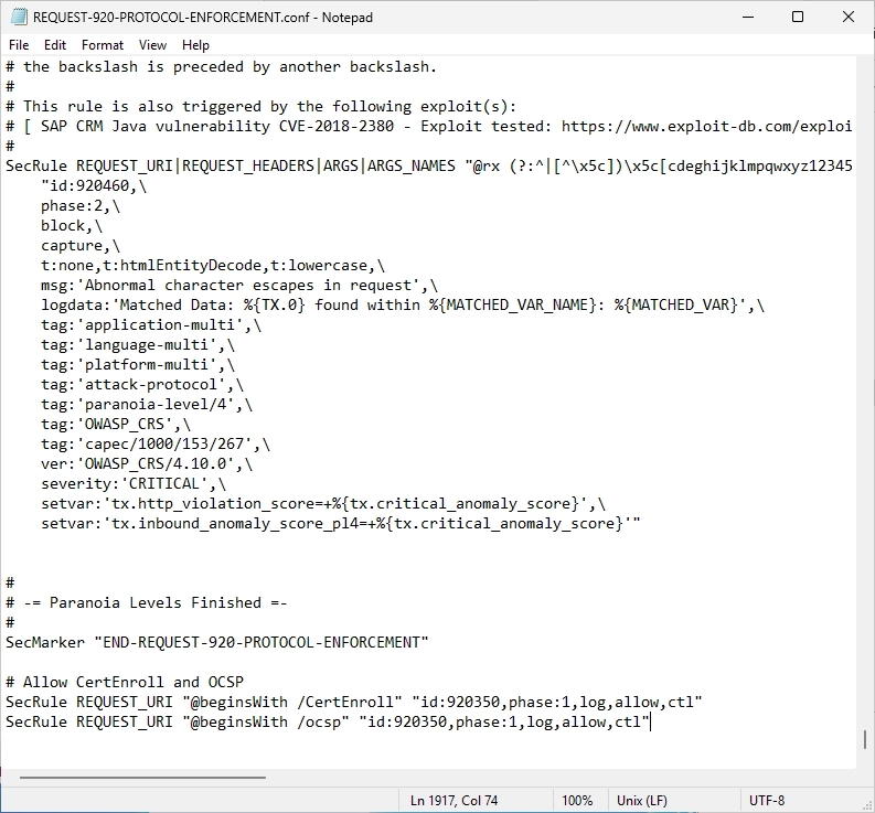 Navigate to the C:\Program Files\ModSecurity IIS\rules folder and search the “REQUEST-920-PROTOCOL-ENFORCEMENT.conf”.