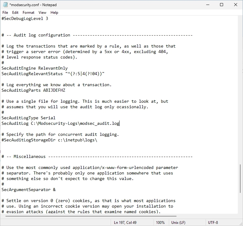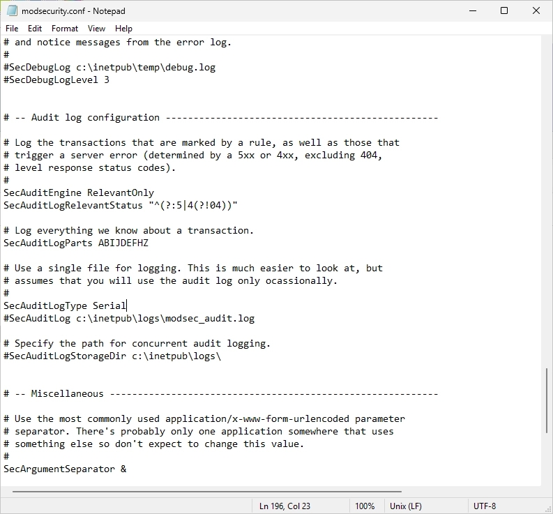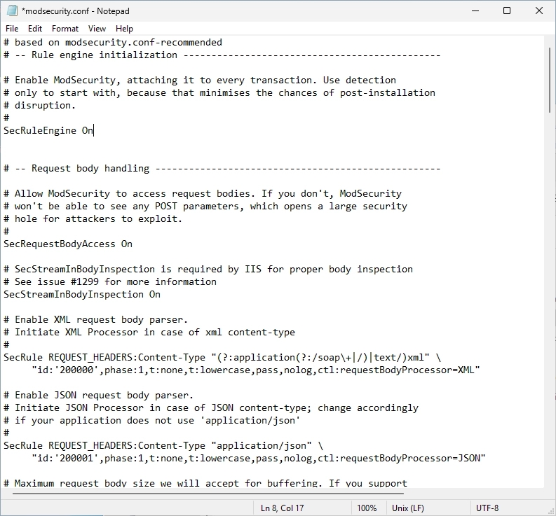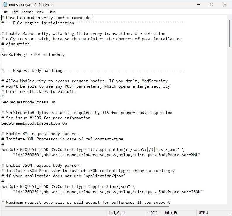 Navigate to the “ModSecurity IIS” path and open the “modsecurity.conf” file again.