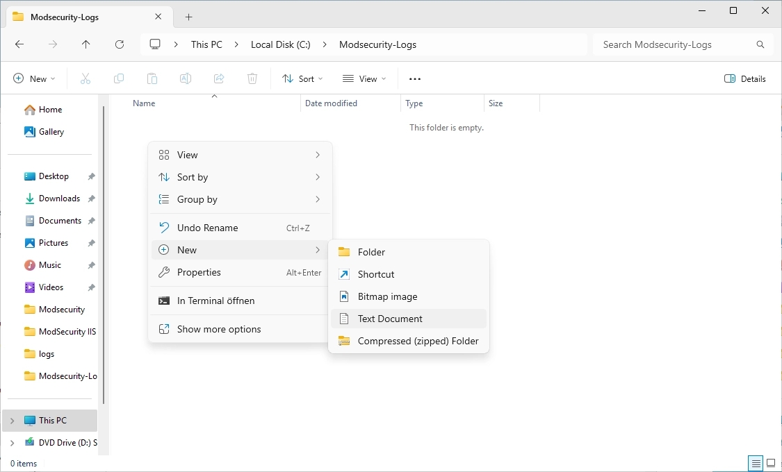In the new “Modsecurity-Logs” folder, create a new Text Document.