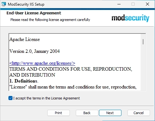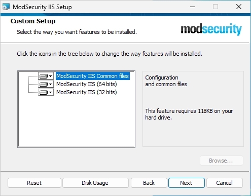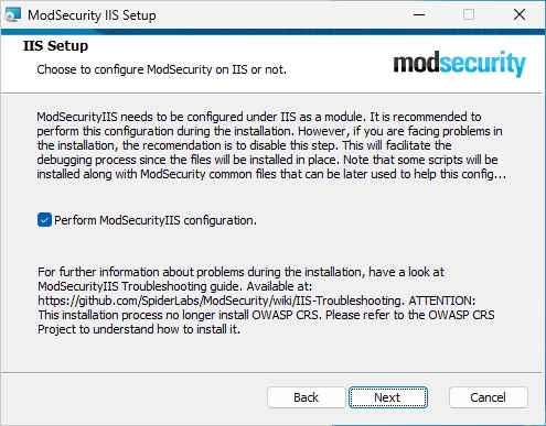 Make sure that the option “Perform ModSecurityIIS configuration.” is selected (should be default).