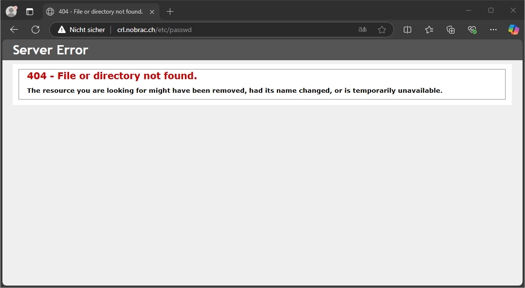 From an external client, enter the published Domain of the your IIS and enter /etc/passwd/ as the path. We should get a 404 error.